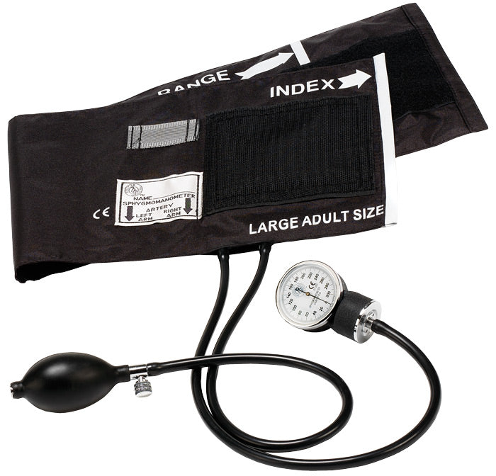 Economical large adult-sized aneroid sphygmomanometer. Black only.